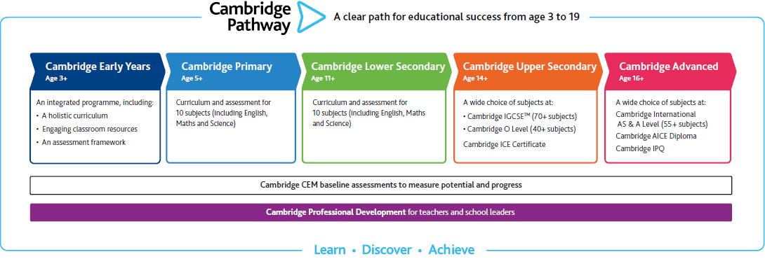 Cambridge Pathway kami diperuntukkan bagi siswa yang berusia 5 hingga 19 tahun. Mata pelajaran yang beragam dan fleksibilitas yang ditawarkan memberikan sekolah kesempatan untuk membentuk kurikulum sehingga membuat hal ini menarik dan relevan bagi para siswa mereka.