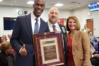 The photograph shows Superintendent Robert W. Runcie (left) with Cambrige International’s Mark Cavone and Sherry Reach.
